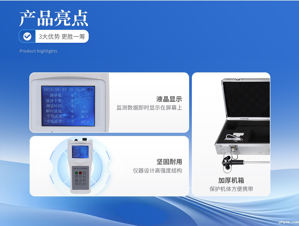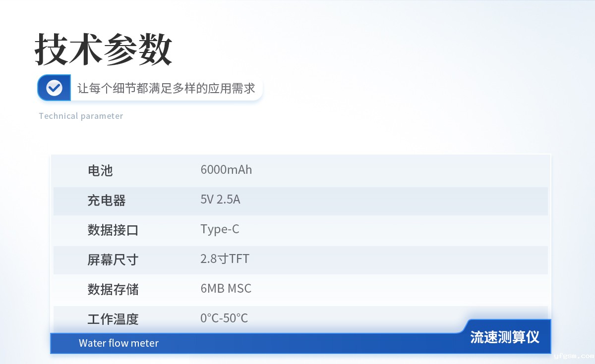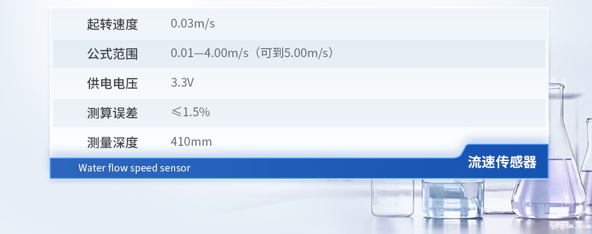 起转速度 :0.03m/s | 公式范围 :0.01—4.00m/s(可到5.00m/s) | 供电电压:3.3V | 测算误差 :≤1.5% | 测量深度 :410mm |