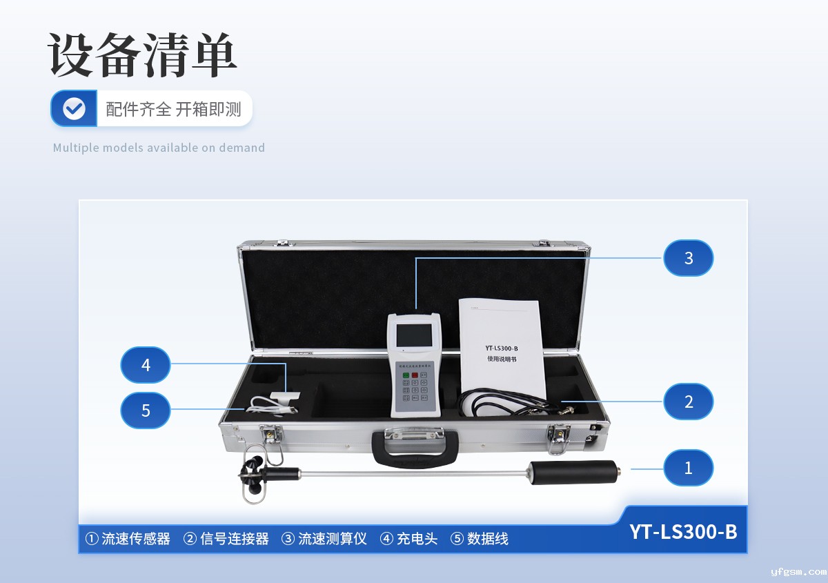 ①流速传感器、②信号连接器、③流速测算仪、④充电头、⑤数据线 |