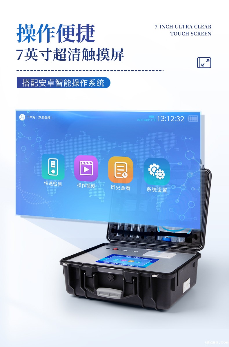 1、主控芯片采用ARM Cortex-A7,RK3288/4核处理器,主频1.88Ghz,运转速度更快速,稳定性更强。 | 2、显示方式:7英寸液晶触摸屏显示,人性化中文操作界面,读数直观、简单。 | 3、交直流两用,直流12V供电,可连接车载电源,可配6ah大容量充电锂电池,方便户外流动测试。 | 4、光源亮度自动调节与校准 | 5、智能恒流稳压,光强自动校准,长时间连续工作光源无温漂现象。。 | 6、内置新国家限量标准,与所测结果进行现场比对,并持续更新标准。内置新国家限量标准,与所测结果进行现场比对,并持续更新标准。 | 6、内置新国家限量标准,与所测结果进行现场比对,并持续更新标准。 | 7、不间断进样,连续检测 | 检测项目可扩充。 | 8、样本编号自动累加。 | 9、检测项目可扩充。 | 10、检测结果可批量打印,批量上传。 | 11、检测结果为Excel表格,连接电脑即可拷贝。 | 12、检测结果存储容量20万条 | 13、支持U盘存储,标准USB接口,免驱动安装。 | 14、固件可升级 |