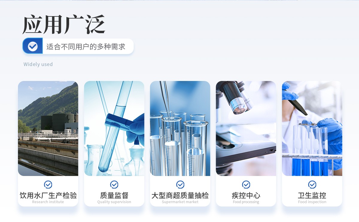 能够广泛的应用于饮用水厂生产检验、市场监督部门质量监督、大型商超质量抽检、疾病控制中心、卫生监控等。