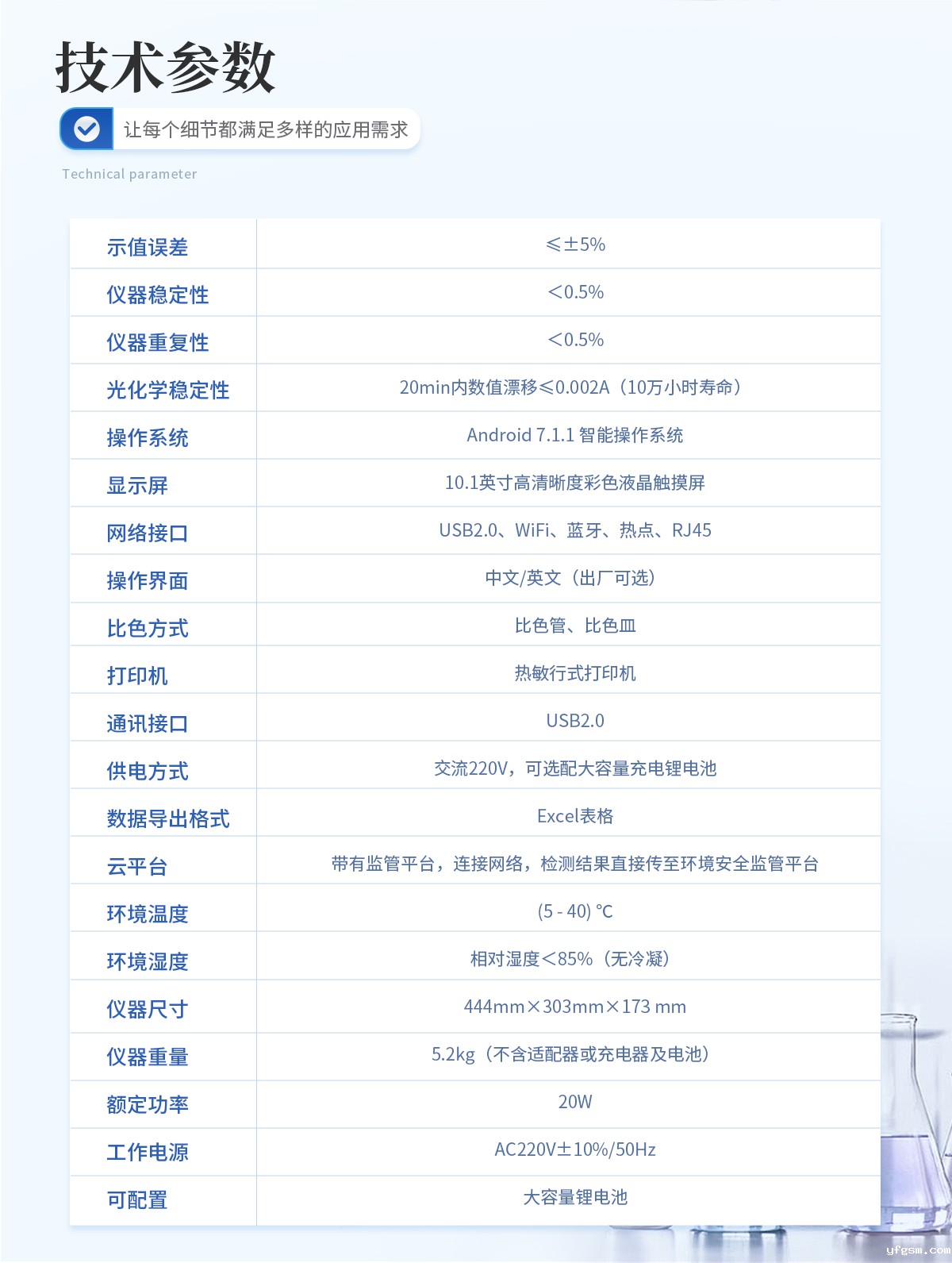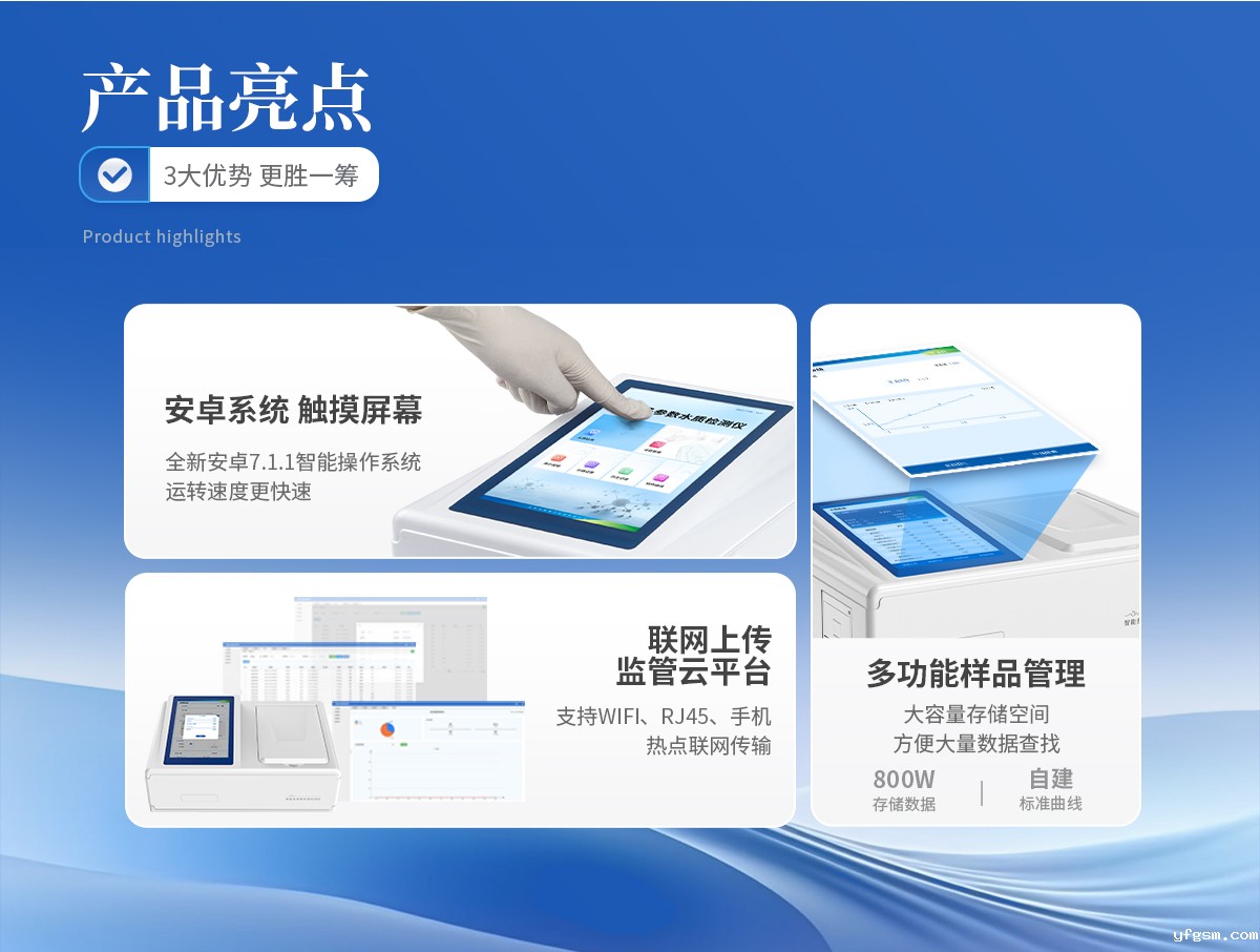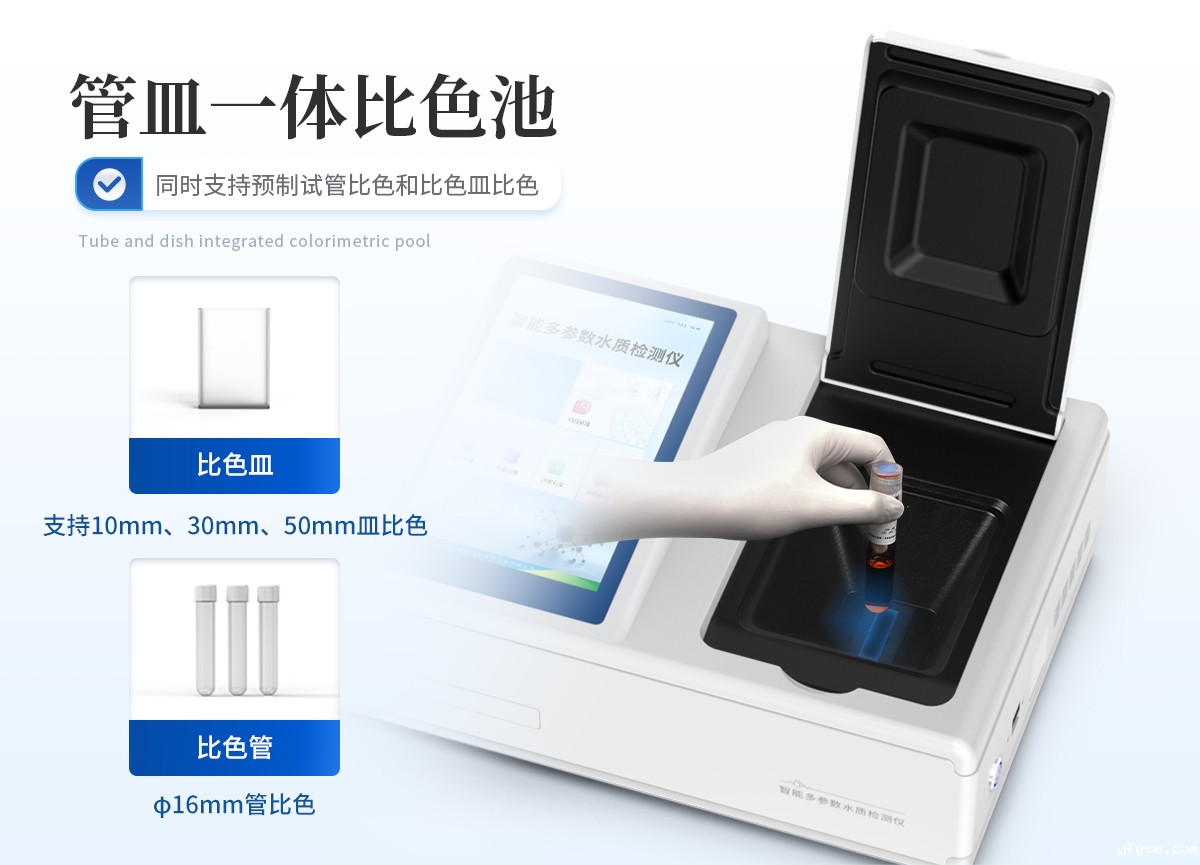 1、采用全新安卓7.1.1智能操作系统,人性化中文操作界面,运转速度更快速,稳定性更强。 | 2、10.1英寸液晶触摸屏显示,人性化中文操作界面,读数直观、简单。 | 3、采用精密比色池设计,使用光源一致,可以解决由于光源误差带来的检测结果误差问题,检测结果更加精准。 | 4、光源采用进口超高亮发光二极管,光源亮度可以自动调节与校准。 | 5、支持10mm、30mm、40mm、50mm皿比色和φ16mm管比色等比色方式,多元选择,确保测量的准确性; | 6、具有无线通讯功能,支持WIFI、RJ45、手机热点联网传输,检测数据亦可通过U盘导出; | 7、多功能样品管理,可对样品进行中英文命名,方便样品记录和数据存储; | 8、仪器可永久存储800万组数据,为方便大量数据查找,可通过时间检索,并随意选择分析; | 9、支持HDMI输出,方便用户培训、讲解、及大屏展示。 | 10、仪器带有监管云平台,数据可通过局域网和互联网上传,亦可对接上传至环境监管部门平台。 | 11、内置热敏行式打印机,打印纸上的内容可自由选择(包括二维码打印); | 12、交流220V,可选配6ah大容量充电锂电池,方便户外流动测试; | 13、内置教学演示视频,用户可一边看仪器内操作视频,一边进行实验操作,更易上手。 | 14、后期产品固件可升级。 |