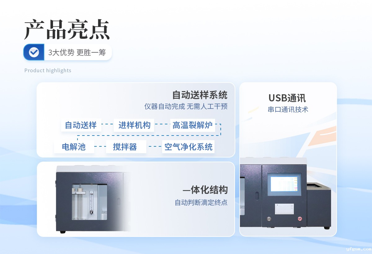 1、 手自一体化自动送样系统,将自动送样、进样机构、高温裂解炉、电解池、搅拌器、空气净化系统等部件巧妙地结合在一起,使仪器结构更加紧凑,更加合理、更加稳定。可在线式插队添加样品,无需人工送样,自动化程度高,若样品少也可采用手动送样方式。 | 2、采用—体化结构,自动判断滴定终点,缩短了实验时间。所有关键部件均采用了设计理念及进行了严格的控制,确保仪器能长时间稳定运行。 | 3、采用特别的数据采集网络及多级校正技术,确保高、中、低硫含量测试结果的准确性。 | 4、送样机构采用电子电解液分子浓度采集电路,可靠性高,不会产生过电解现象。 | 5、串口通讯技术,可采用usb通讯,兼容性好,具有广泛的适用性。 | 6、自由设置送样时间及预置温度,采用进口霍尔元件控制送样位置。 | 7、采用刚玉瓷舟,减少卡样的可能。一次可放1-24个样由程序控制实现自动升温、控温、送样、测定,结果自动存盘、自动打印,并可中途在线式插队添加试样,大大地提高了工作效率,真正实现无人值守; | 8、采用库仑滴定法进行测定,测定时间可根据不同试样自动判断,速度优于艾士卡重量分析法和高温燃烧中和法; |
