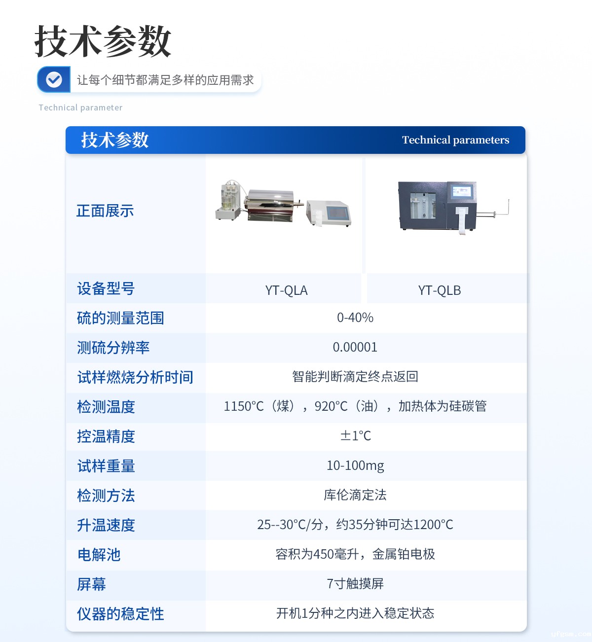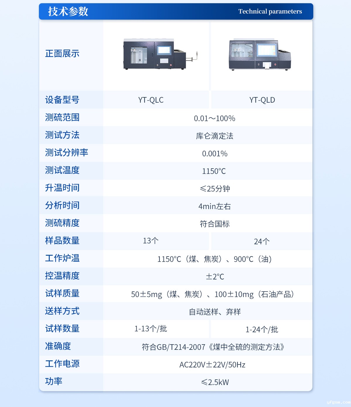 测硫范围:0.01~100% | 测试方法:库仑滴定法 | 测试分辨率:0.001% | 测试温度:1150℃ | 升温时间:≤25分钟 | 分析时间:4min左右 | 测硫精度:符合国标 | 样品数量:24个 | 工作炉温:1150℃(煤、焦炭)、900℃(油) | 控温精度:±2℃ | 试样质量:50±5mg(煤、焦炭)、100±10mg(石油产品) | 送样方式:自动送样、弃样 | 试样数量:1-24个/批,试验过程可添加/替换试样 | 准确度:符合GB/T214-2007《煤中全硫的测定方法》 | 工作电源:AC220V±22V/50Hz 功率:≤2.5kW |